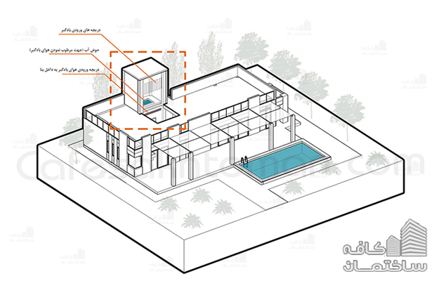 ساختمان دارای بادگیر با دو کاربرد بنا شده است. این سازه هم ارتفاع قرارگیری منبع آب را تامین می کند و هم با جزئیاتی که برای آن در نظر گرفته شده تهویه طبیعی ساختمان را در فصول گرم بهبود می بخشد. نحوه قرارگیری بادگیر به گونه ای است که ورودی آن به سمت جهت مناسب باد قرار گیرد به طوری که هوا پس از ورود با عبور از یک حوضچه مرطوب تهویه ای طبیعی برای ساختمان فراهم می کند. علاوه بر انتخاب مصالح بومی همچون آجر، به مسائل تکنیکی ساخت مانند عایق حرارتی پوسته های ساختمان توجه شده است. دیوارها به صورت دو پوسته آجری در داخل و خارج و یک لایه عایق میانی طراحی شده که هر دو پوسته داخلی و خارجی به عنوان سطح نهایی عمل می کنند.