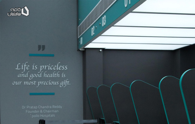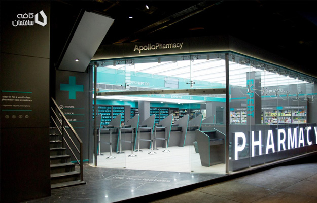 طراحی این داروخانه واقع در حیدر آباد هند با هدف ایجاد فضایی کاربردی و کنترل فضای داخل در ساعات شلوغی انجام پذیرفته، مجاورت این داروخانه با بیمارستان و مراجعه تعداد زیادی از بیماران در این قسمت پیشخوان هایی تعبیه شده تا در عین خدمت رسانی منظم تر، بخش های مختلف داروخانه از هم تفکیک شوند. استفاده از رنگ طوسی و ترکیب آن با رنگ آبی، فضایی سرد و در عین حال هیجان آور به وجود آورده که این هیجان و تنوع، حاصل بهره گیری از رنگ آبی روشن است. تفکیک هر بخش با استفاده از پارتیشن های کوتاه و مبلمان فضا در این داروخانه قابل توجه است که علاوه بر استفاده مفید از فضا های مرکزی و بلااستفاده به ایجاد خطوط منظم و هندسه ای گویا انجامیده است.